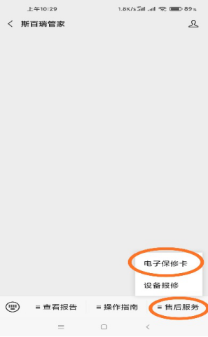 1. 先打開手機微信,添加公眾號"斯百瑞管家“,點擊關(guān)注。點擊菜單”售后服務(wù)“----電子保修卡;(圖一)