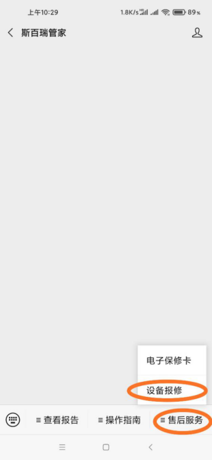1. 首先打開手機(jī)微信在添加公眾“斯百瑞管家” ,點(diǎn)擊關(guān)注后,點(diǎn)擊售后服務(wù)菜單,選擇設(shè)備報修(如圖一),
