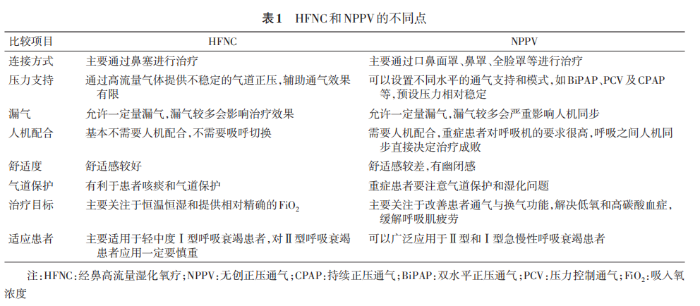 HFNC和NPPV在治療原理上存在許多相似之處。從工作原理上看,都是電動(dòng)渦輪機(jī)驅(qū)動(dòng)形成高速氣流,通過(guò)電磁閥實(shí)現(xiàn)流量可控,氣流均可加溫加濕,都是傳統(tǒng)意義上的正壓通氣,能夠維持一定水平的PEEP,實(shí)現(xiàn)氣道開(kāi)放,減少死腔,改善通氣,且允許開(kāi)放氣道發(fā)生漏氣。HFNC和NPPV的不同點(diǎn)見(jiàn) 表1 [16,17] 。